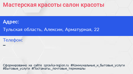 Мастерская красоты, салон красоты по адресу Тульская область, Алексин, Арматурная, 22 в дальнейшем Организация, размещена в следующих категориях: