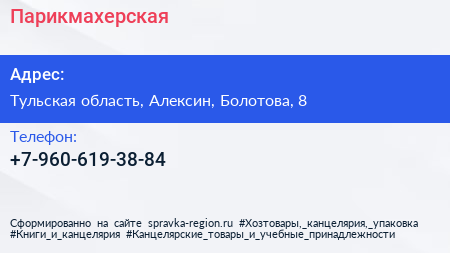 Парикмахерская по адресу Тульская область, Алексин, Болотова, 8 в дальнейшем Организация, размещена в следующих категориях: