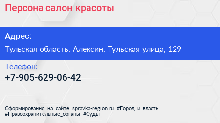 Персона, салон красоты по адресу Тульская область, Алексин, Тульская улица, 129 в дальнейшем Организация, размещена в следующих категориях: