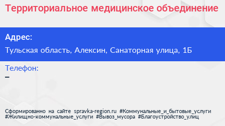 Территориальное медицинское объединение по адресу Тульская область, Алексин, Санаторная улица, 1Б в дальнейшем Организация, размещена в следующих категориях: