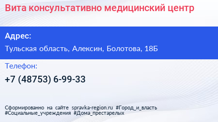 Вита, консультативно-медицинский центр по адресу Тульская область, Алексин, Болотова, 18Б в дальнейшем Организация, размещена в следующих категориях: