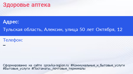 Здоровье, аптека по адресу Тульская область, Алексин, улица 50 лет Октября, 12 в дальнейшем Организация, размещена в следующих категориях: