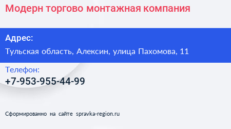 Модерн, торгово-монтажная компания по адресу Тульская область, Алексин, улица Пахомова, 11 в дальнейшем Организация, размещена в следующих категориях: