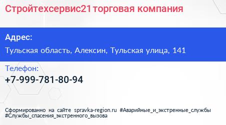 Стройтехсервис21, торговая компания по адресу Тульская область, Алексин, Тульская улица, 141 в дальнейшем Организация, размещена в следующих категориях:
