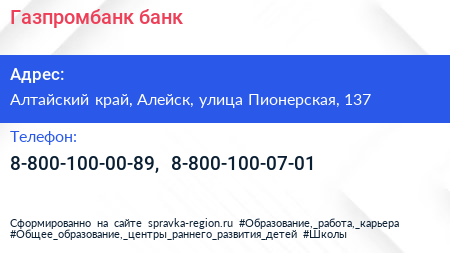Газпромбанк, банк по адресу Алтайский край, Алейск, улица Пионерская, 137 в дальнейшем Организация, размещена в следующих категориях: