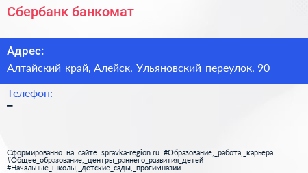 Сбербанк, банкомат по адресу Алтайский край, Алейск, Ульяновский переулок, 90 в дальнейшем Организация, размещена в следующих категориях: