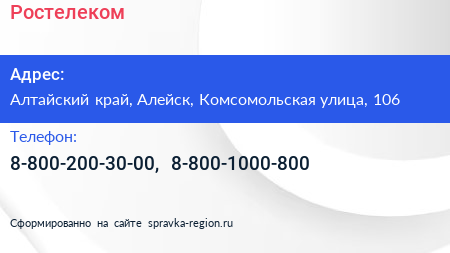 Ростелеком по адресу Алтайский край, Алейск, Комсомольская улица, 106 в дальнейшем Организация, размещена в следующих категориях: