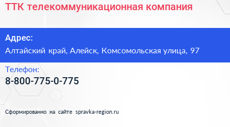 ТТК, телекоммуникационная компания по адресу Алтайский край, Алейск, Комсомольская улица, 97 в дальнейшем Организация, размещена в следующих категориях: