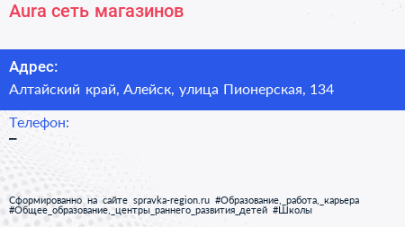 Aura, сеть магазинов по адресу Алтайский край, Алейск, улица Пионерская, 134 в дальнейшем Организация, размещена в следующих категориях: