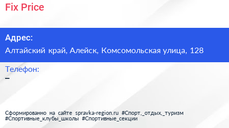 Fix Price по адресу Алтайский край, Алейск, Комсомольская улица, 128 в дальнейшем Организация, размещена в следующих категориях: