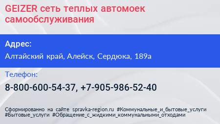 GEIZER, сеть теплых автомоек самообслуживания по адресу Алтайский край, Алейск, Сердюка, 189а в дальнейшем Организация, размещена в следующих категориях: