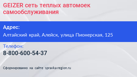 GEIZER, сеть теплых автомоек самообслуживания по адресу Алтайский край, Алейск, улица Пионерская, 125 в дальнейшем Организация, размещена в следующих категориях:
