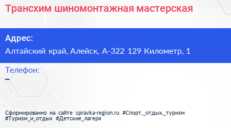 Трансхим, шиномонтажная мастерская по адресу Алтайский край, Алейск, А-322 129 Километр, 1 в дальнейшем Организация, размещена в следующих категориях: