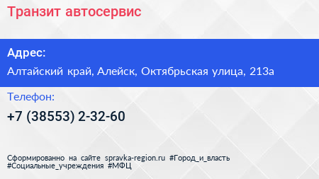 Транзит, автосервис по адресу Алтайский край, Алейск, Октябрьская улица, 213а в дальнейшем Организация, размещена в следующих категориях: