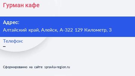 Гурман, кафе по адресу Алтайский край, Алейск, А-322 129 Километр, 3 в дальнейшем Организация, размещена в следующих категориях: