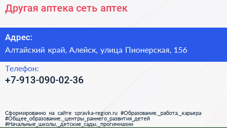 Другая аптека, сеть аптек по адресу Алтайский край, Алейск, улица Пионерская, 156 в дальнейшем Организация, размещена в следующих категориях: