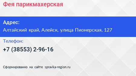 Фея, парикмахерская по адресу Алтайский край, Алейск, улица Пионерская, 127 в дальнейшем Организация, размещена в следующих категориях: