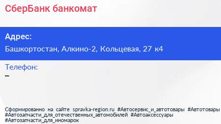 СберБанк, банкомат по адресу Башкортостан, Алкино-2, Кольцевая, 27 к4 в дальнейшем Организация, размещена в следующих категориях: