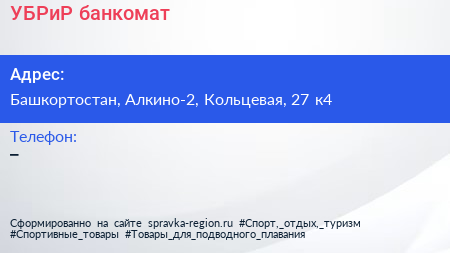 УБРиР, банкомат по адресу Башкортостан, Алкино-2, Кольцевая, 27 к4 в дальнейшем Организация, размещена в следующих категориях: