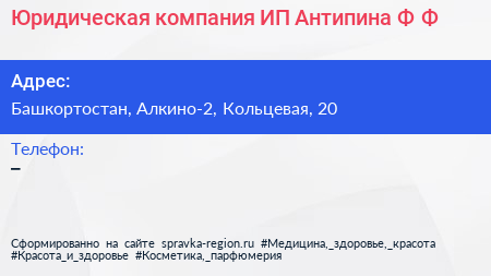 Юридическая компания, ИП Антипина Ф.Ф. по адресу Башкортостан, Алкино-2, Кольцевая, 20 в дальнейшем Организация, размещена в следующих категориях: