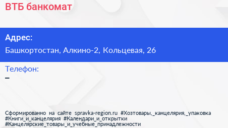 ВТБ, банкомат по адресу Башкортостан, Алкино-2, Кольцевая, 26 в дальнейшем Организация, размещена в следующих категориях: