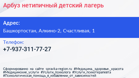 Арбуз, нетипичный детский лагерь по адресу Башкортостан, Алкино-2, Счастливая, 1 в дальнейшем Организация, размещена в следующих категориях: