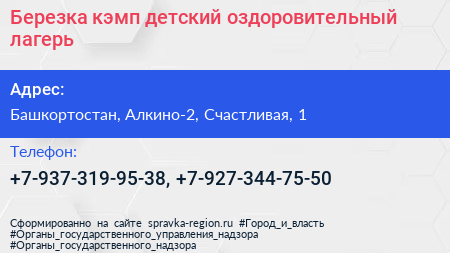 Березка кэмп, детский оздоровительный лагерь по адресу Башкортостан, Алкино-2, Счастливая, 1 в дальнейшем Организация, размещена в следующих категориях: