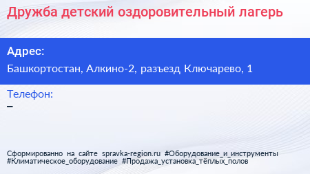 Дружба, детский оздоровительный лагерь по адресу Башкортостан, Алкино-2, разъезд Ключарево, 1 в дальнейшем Организация, размещена в следующих категориях: