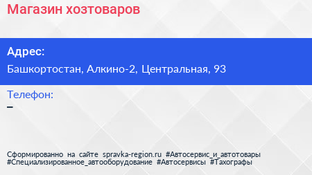 Магазин хозтоваров по адресу Башкортостан, Алкино-2, Центральная, 93 в дальнейшем Организация, размещена в следующих категориях: