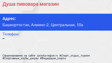 Душа пивовара, магазин по адресу Башкортостан, Алкино-2, Центральная, 10а в дальнейшем Организация, размещена в следующих категориях:
