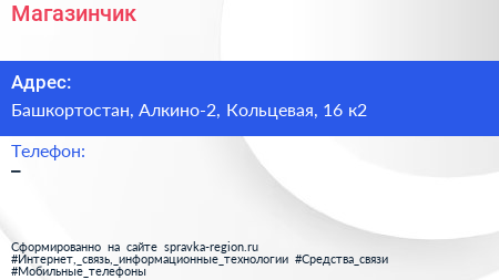 Магазинчик по адресу Башкортостан, Алкино-2, Кольцевая, 16 к2 в дальнейшем Организация, размещена в следующих категориях: