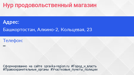 Нур, продовольственный магазин по адресу Башкортостан, Алкино-2, Кольцевая, 23 в дальнейшем Организация, размещена в следующих категориях: