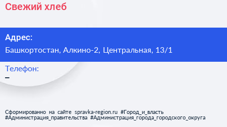 Свежий хлеб по адресу Башкортостан, Алкино-2, Центральная, 13/1 в дальнейшем Организация, размещена в следующих категориях: