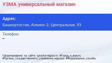 УЗМА, универсальный магазин по адресу Башкортостан, Алкино-2, Центральная, 93 в дальнейшем Организация, размещена в следующих категориях: