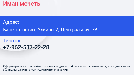 Иман, мечеть по адресу Башкортостан, Алкино-2, Центральная, 79 в дальнейшем Организация, размещена в следующих категориях: