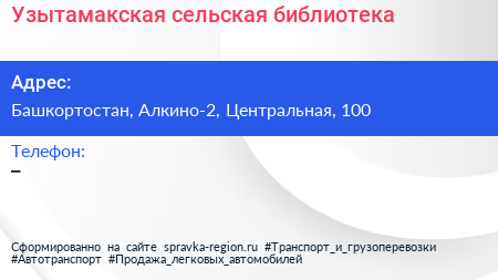 Узытамакская сельская библиотека по адресу Башкортостан, Алкино-2, Центральная, 100 в дальнейшем Организация, размещена в следующих категориях: