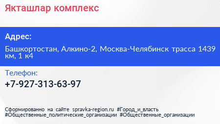 Якташлар, комплекс по адресу Башкортостан, Алкино-2, Москва-Челябинск трасса 1439 км, 1 к4 в дальнейшем Организация, размещена в следующих категориях: