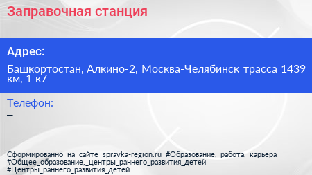 Заправочная станция по адресу Башкортостан, Алкино-2, Москва-Челябинск трасса 1439 км, 1 к7 в дальнейшем Организация, размещена в следующих категориях: