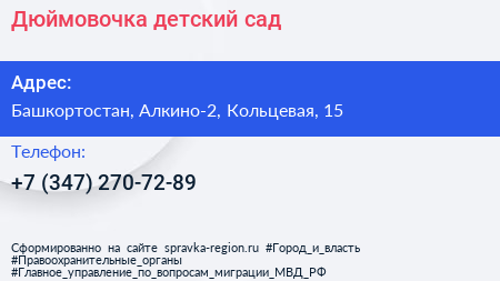 Дюймовочка, детский сад по адресу Башкортостан, Алкино-2, Кольцевая, 15 в дальнейшем Организация, размещена в следующих категориях: