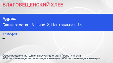 БЛАГОВЕЩЕНСКИЙ ХЛЕБ по адресу Башкортостан, Алкино-2, Центральная, 14 в дальнейшем Организация, размещена в следующих категориях: