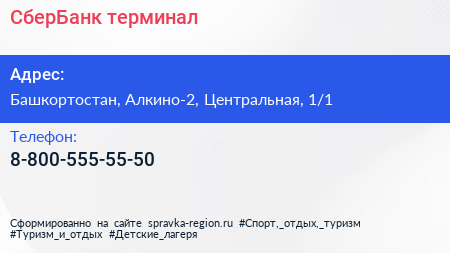 СберБанк, терминал по адресу Башкортостан, Алкино-2, Центральная, 1/1 в дальнейшем Организация, размещена в следующих категориях: