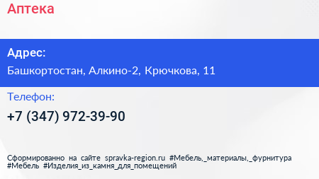 Аптека по адресу Башкортостан, Алкино-2, Крючкова, 11 в дальнейшем Организация, размещена в следующих категориях: