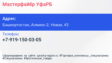 Мастерфайбр УфаРБ по адресу Башкортостан, Алкино-2, Новая, 43 в дальнейшем Организация, размещена в следующих категориях: