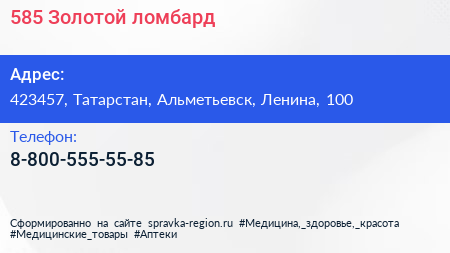 585*Золотой, ломбард по адресу 423457, Татарстан, Альметьевск, Ленина, 100 в дальнейшем Организация, размещена в следующих категориях: