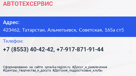 АВТОТЕХСЕРВИС по адресу 423462, Татарстан, Альметьевск, Советская, 165а ст5 в дальнейшем Организация, размещена в следующих категориях: