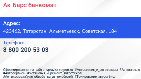 Ак Барс, банкомат по адресу 423462, Татарстан, Альметьевск, Советская, 184 в дальнейшем Организация, размещена в следующих категориях: