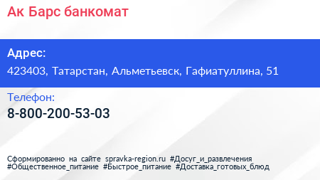 Ак Барс, банкомат по адресу 423403, Татарстан, Альметьевск, Гафиатуллина, 51 в дальнейшем Организация, размещена в следующих категориях: