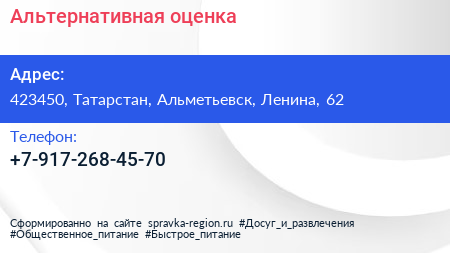 Альтернативная оценка по адресу 423450, Татарстан, Альметьевск, Ленина, 62 в дальнейшем Организация, размещена в следующих категориях: