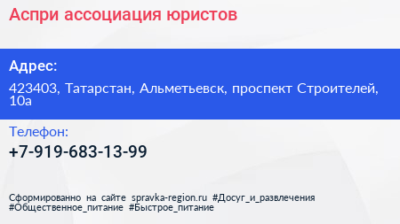 Аспри, ассоциация юристов по адресу 423403, Татарстан, Альметьевск, проспект Строителей, 10а в дальнейшем Организация, размещена в следующих категориях: