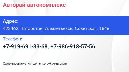 Авторай, автокомплекс по адресу 423462, Татарстан, Альметьевск, Советская, 184в в дальнейшем Организация, размещена в следующих категориях: